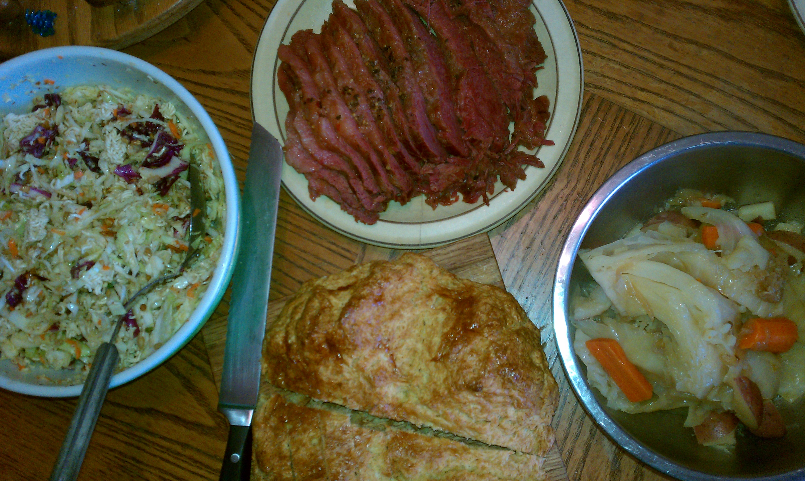 This year I had also made an Asian Ramen salad to go with the meal, because our 10yo is not at all adventurous when it comes to new foods and she’d never had Corned Beef before.  I knew she’d eat the Ramen salad, which although it was very good, was completely unnecessary because she loved the corned beef.  Tomorrow we have Rubens!