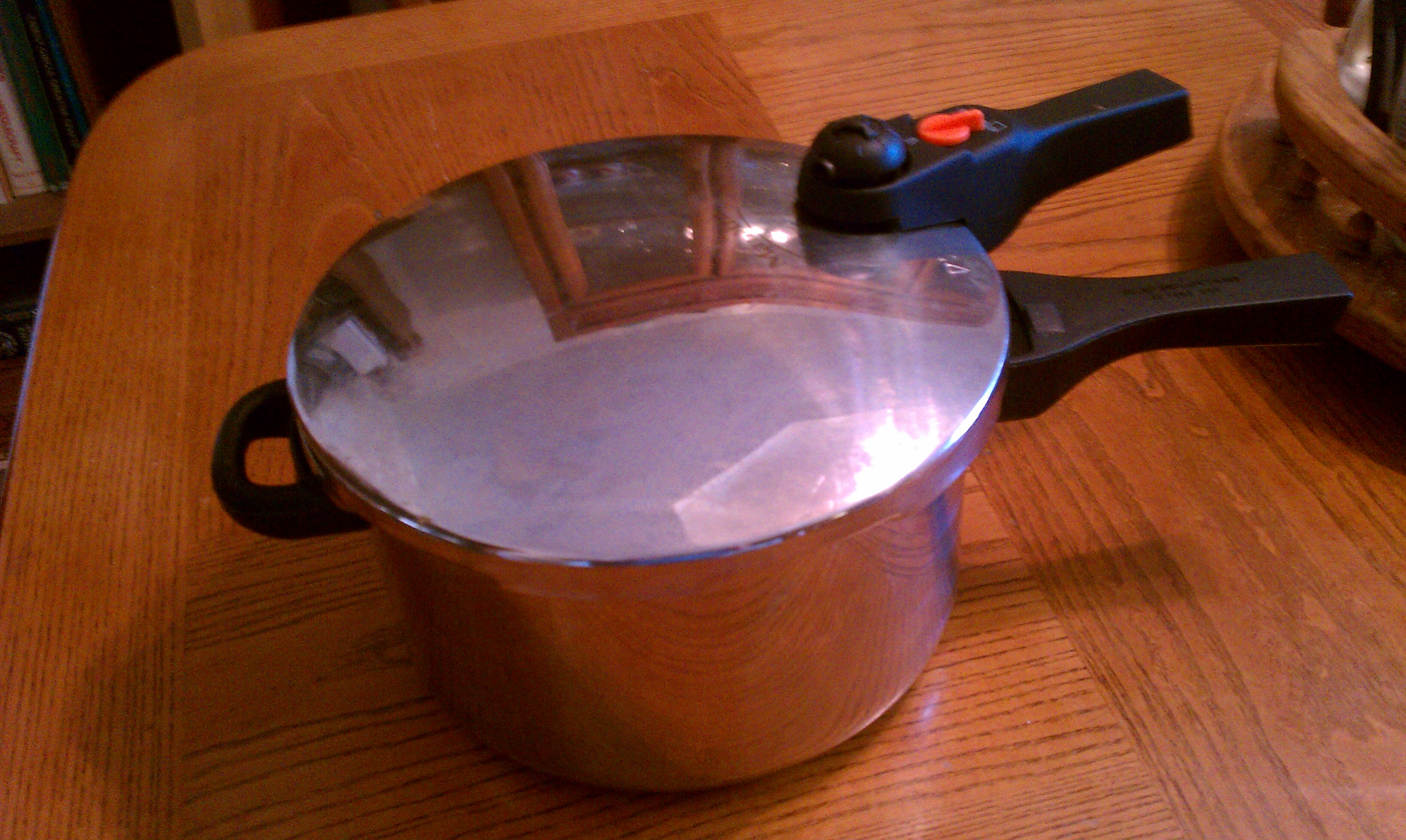 My Pressure CookerPressure cooking is sort of a mystery to me.  I actually only own a pressure cooker because I saw one on a clearance rack at KMart several years ago for 10 bucks and couldn’t stop myself from buying it.  It sat in my cupboard for several years, just because I was half afraid of the thing.  Eventually I lost the manual to it.  Last summer I tried to sell it in a garage sale for $5, but nobody would buy it.  I had a couple of men looking it over very closely — examining the rubber seal for signs of wear and tear, turning it this way and that looking for scrapes or dents, discussing it in depth with one another.  It was, at that moment, brand new and completely unused, which if English had been their native language, they might have understood.  In the end, they left the cooker sitting on the table and moved on to the next garage sale with their 25¢ t-shirts.