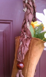 Affix your strips, along with the decorative jute braid, to a steady mount and make a loose, 5 strand braid.  Secure each end of the braid with a decorative macrame bead or other decorative tie off at each end.