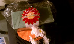 • 1 piece of scrap fabric, preferably corduory or denim — something with some substance to it.  You’ll need to be able to cut two pieces of at least 9″ x 10″, plus three sides, about 4″ wide, and 10″ long each.  Use your floral foam blocks as your pattern.