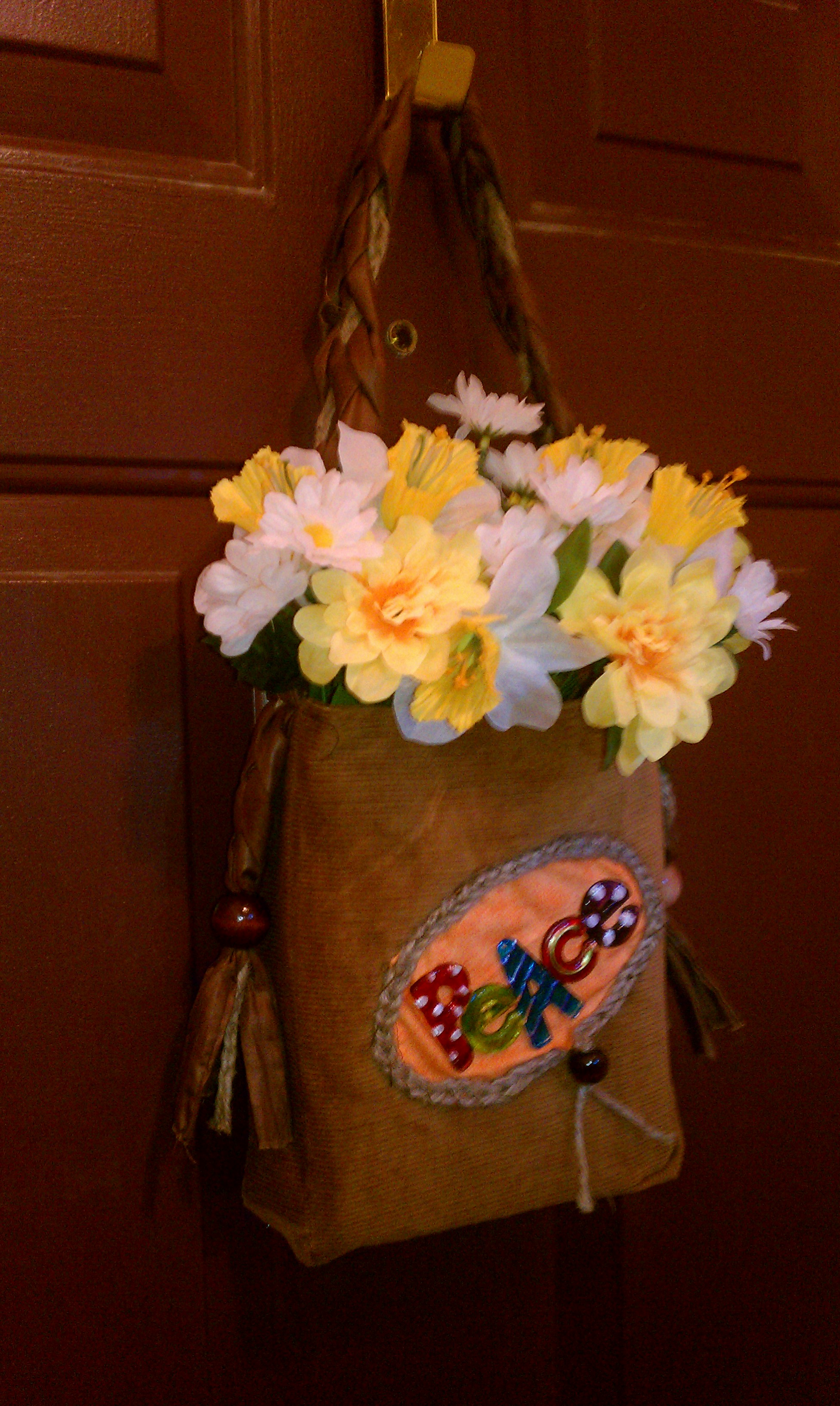 My ornament didn’t show up well against brown fabric, so I created an applique of my own.  I used the bottom of a serving bowl in my cabinet for the oval shape, then I zigzaged the outer edge of the oval to limit fraying.  Then, to tie the applique to the basket, I crocheted a single strand of jute into a chain long enough to go around the outside edge of the oval and whip stitched the jute chain in place, adding a finishing bead to anchor it.  I used fabric glue to affix the “peace” to the center of the oval (which I’ll reinforce later with some invisible nylon thread) and allowed the decoration to dry.  Once dried, I whip stitched the applique to the basket to complete the project.  Total time was about two hours from start to finish and the cost was less than $20.