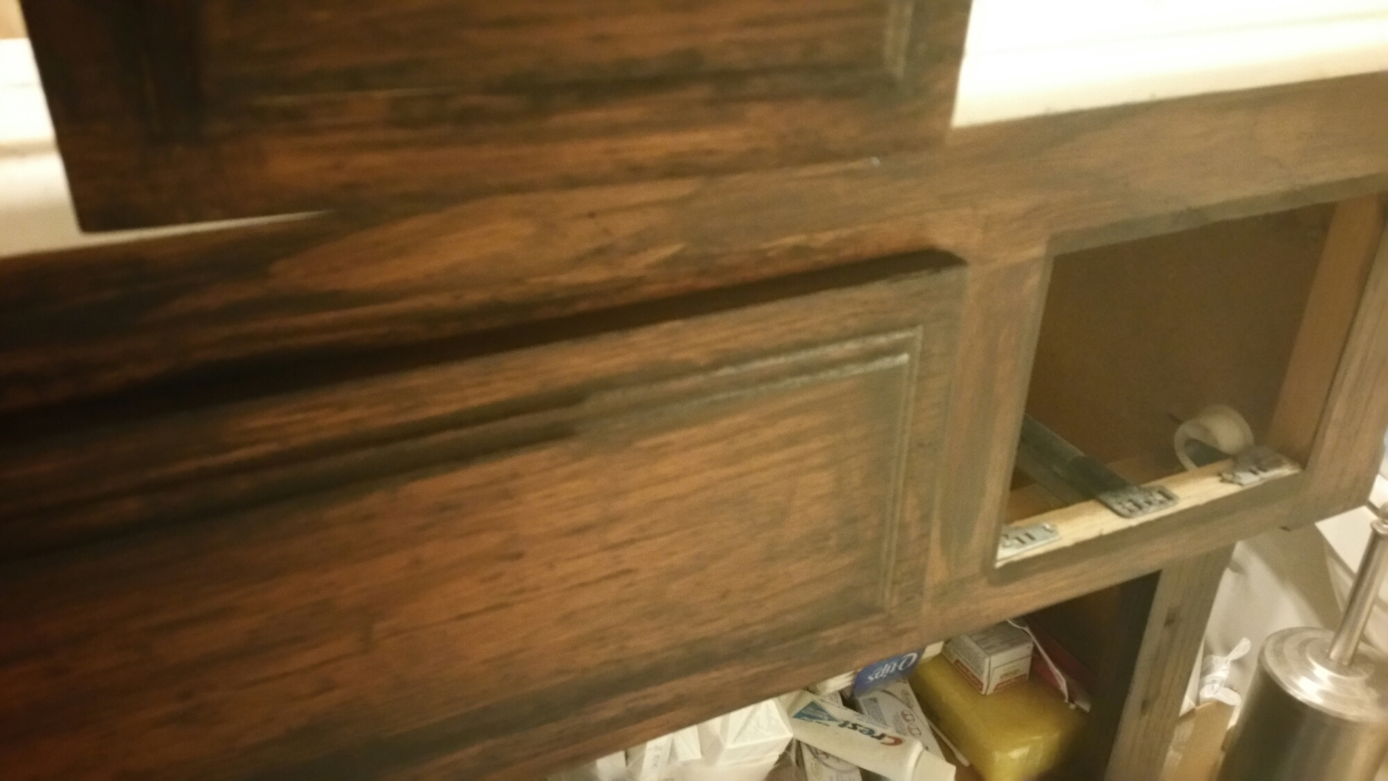 Over my Christmas break, I decided it was time to update the bathroom vanity in our Master. 30+ years was showing on the finish. I love the look of the General Finishes gel stain product, and we had used it over the Christmas break in 2014 in the kitchen. The Java color seems to be really in style right now as well if you pay attention to all the home flipping and DIY shows on HGTV and DIY Network.
