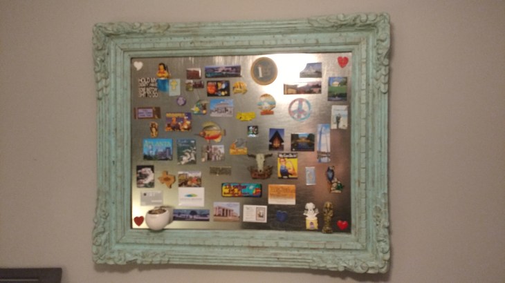 We bought a new fridge a couple of weeks ago. My old ivory side-by-side fridge was also my travel memory board with magnets from all my various travels in the last 10 years. My fridge always looked cluttered and messy though, which I didn’t like. I couldn’t bring myself to clutter the front of my shiny new stainless steel fridge.